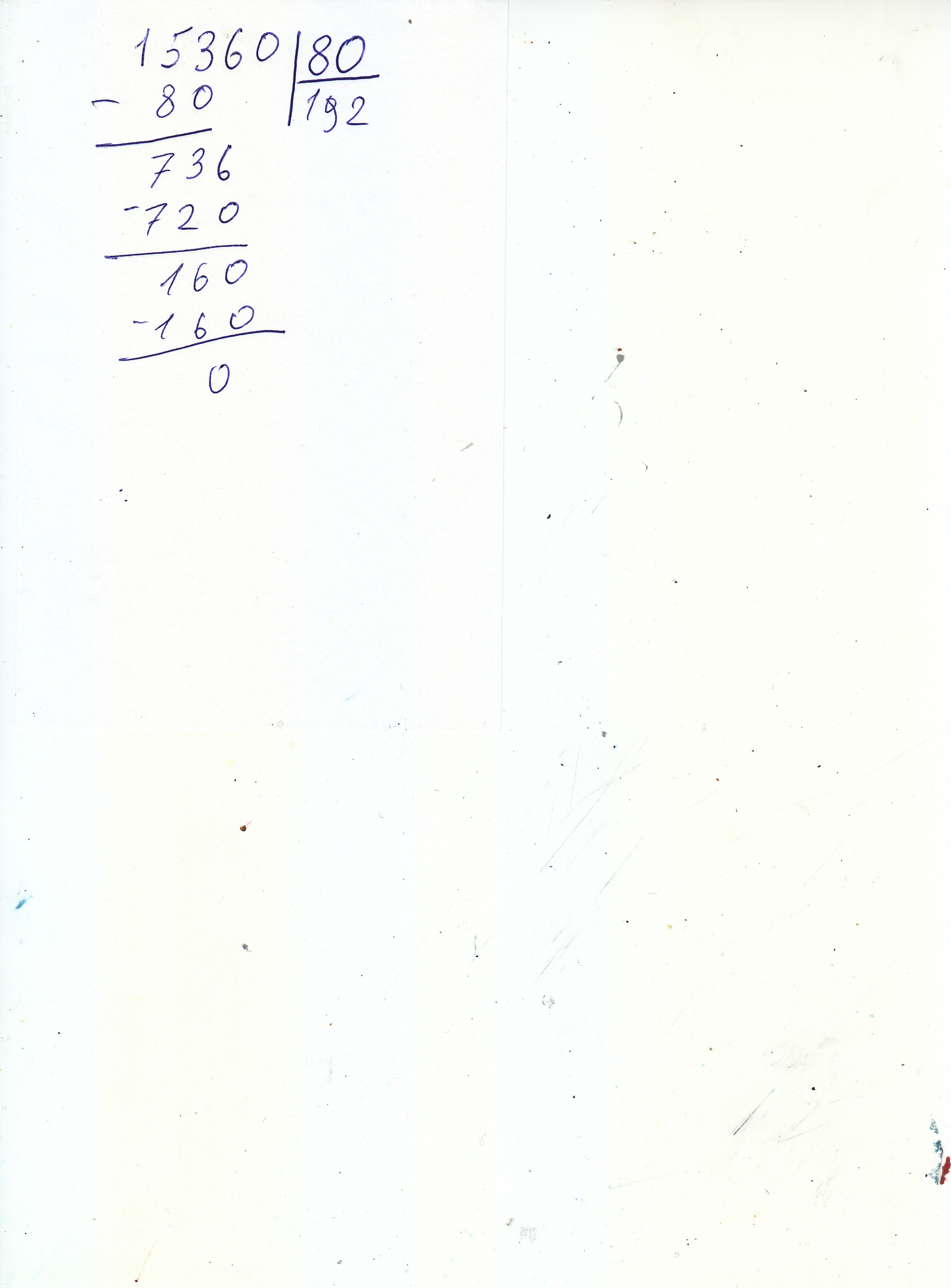 Значит берем по 80. Далее. Будет 73, добавляем шесть. Берем 80, по 9 раз, то есть умножаем. 736 минус 720. Будет 16. Сносим ноль. Берем 80 по два раза. 160 - 160 = 0. Легко. Смотри, как решается в файле.