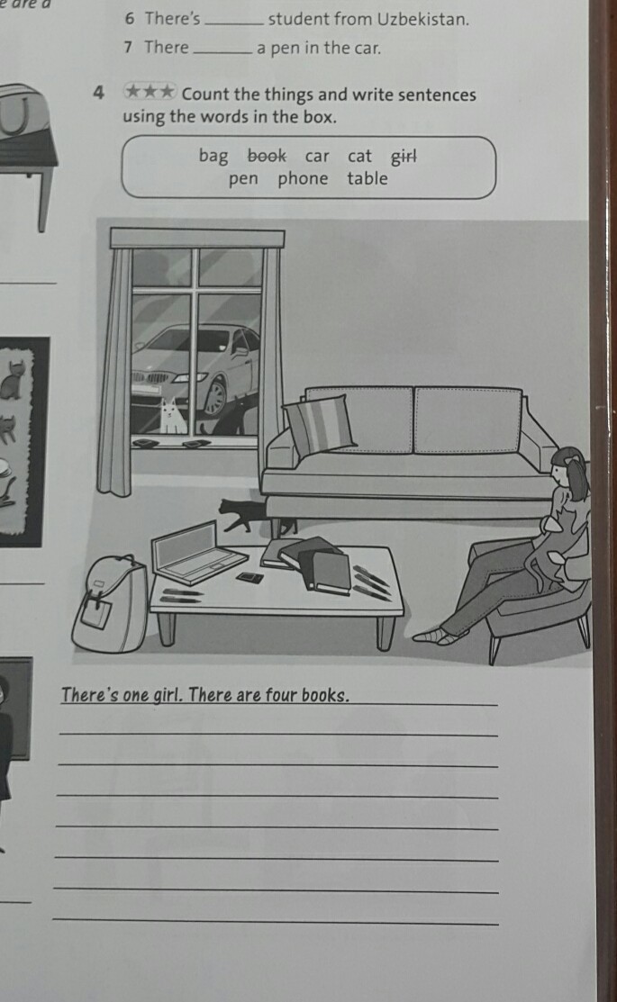There are 3 cats. There is one car .There are five pens .There is one table. There is one phone.