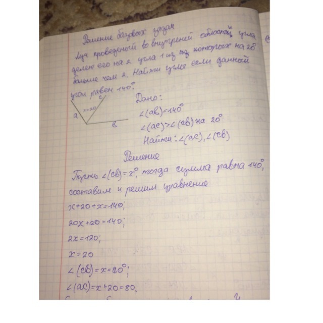 Возьми любых два угла. На пример 160 и 90 градусов. И просто проведи луч. Как то вырази один угол через другой. К примеру если 160 градусов возьми угол первый равен х, а угол второй х - 40. То угол один равен 100 градусов, а второй аналогична всему углу минус этот угол, что есть 60(х+х-40=160) А если 90, то модна угол первый х, а второй 2х. Тогда угол первый есть 30 градусов, а второй 60 (х + 2х=90). Всегда пожалуйста)