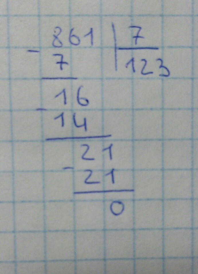 2.1 мы не можем разделить на 7 ,так что сносим к 1 6,сколько раз 7 поместится в 16 -2 раза,2*7=14,пишим под 16 и вычитаем,16-14=2