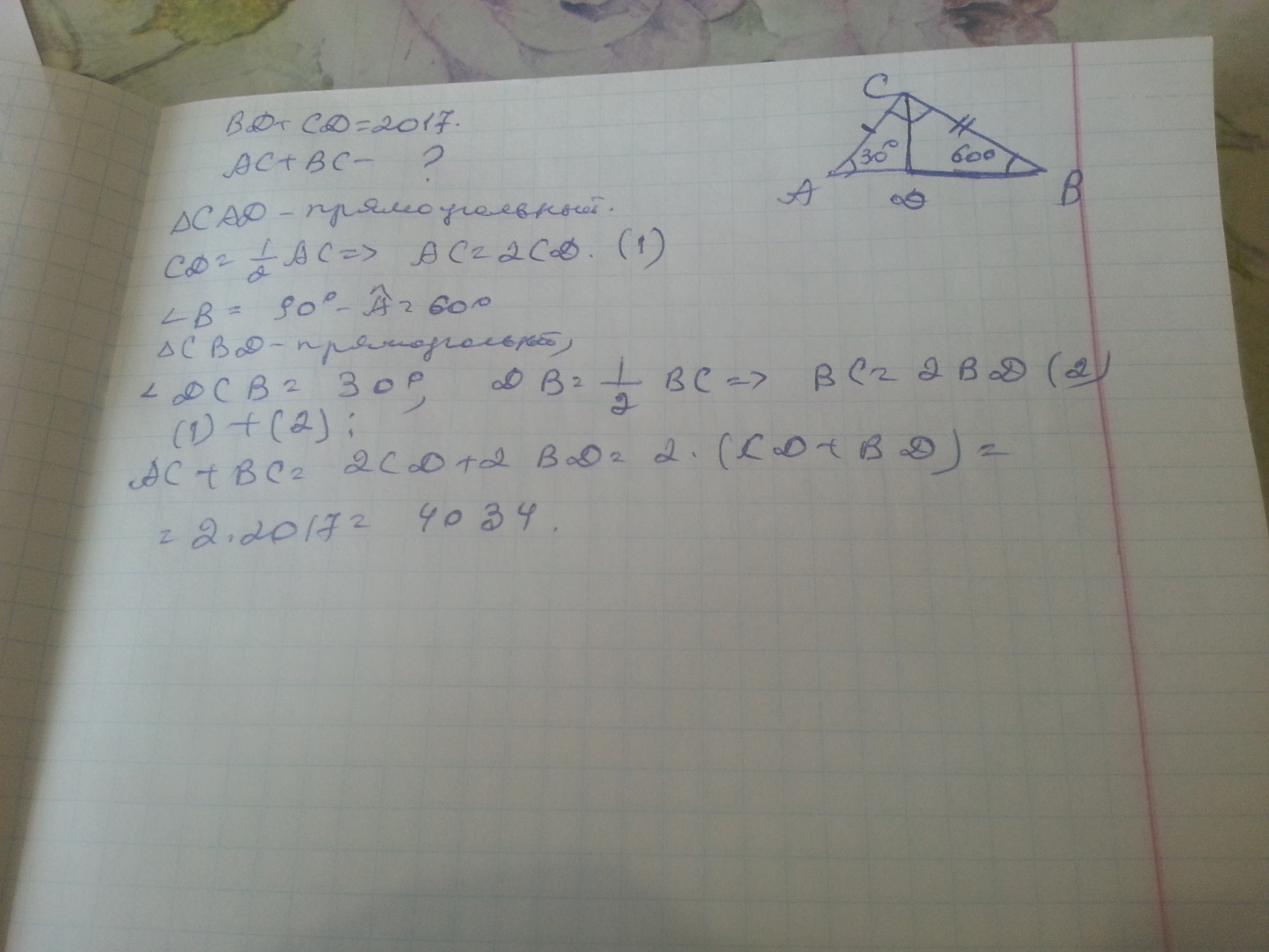 В треугольнике АВС с углами АСВ=90°,ВАС=30° проведена высота CD.Найдите сумму длин катетов треугольника АВС,если BD+CD=2017.