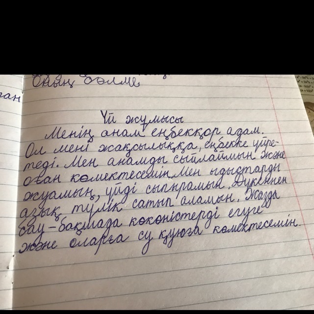 Моя мама очень трудолюбивая.Она учить и меня чистоте и к труду. Я уважаю и люблю свою маму. Я пою посуду, подметаю дома,хожу в магазин.Летом я помогаю сажать и полевать урожай.