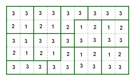1) Чтобы сумма чисел в зеленых квадратах 2×2 была максимальной, каждый квадрат должен состоять из 1, 2, 3, 3, что верно для всех зеленых квадратов из данной расстановки.