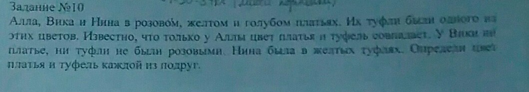Нина - жёлтые туфли, голубое платье, Вика - розовые туфли, розовое платье, Алла - голубые туфли, желтое платье.