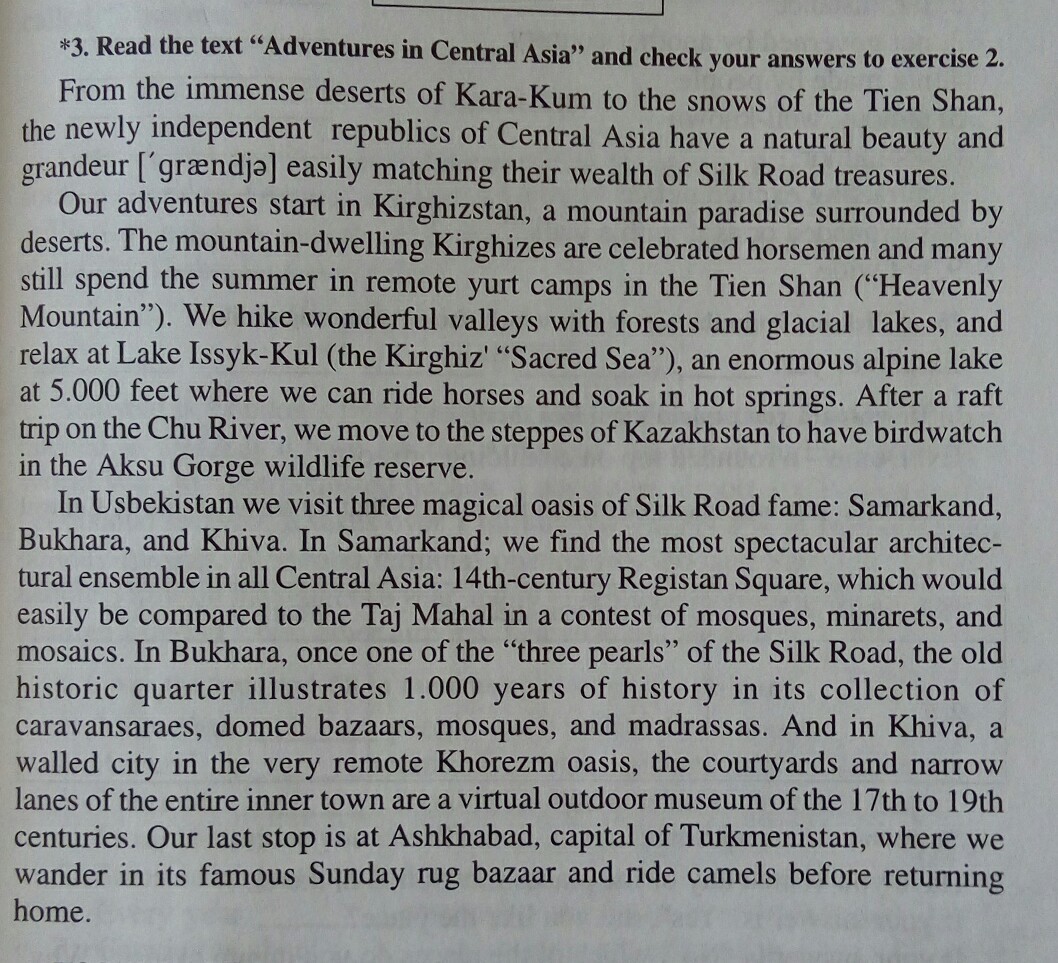 От огромных пустынь Каракум до снегjd Тянь-Шаня, в новых независимых республиках Центральной Азии есть природная красота и величие, легко соответствующие их богатству сокровищ Великого Шелкового пути. Наши приключения начинаются в Кыргызстане, горном раю, окруженном пустынями. Горные киргизы отмечают всадников, а многие еще проводят лето в отдаленных юртовых лагерях в Тянь-Шане («Небесная гора»), Мы путешествуем по прекрасным долинам с лесами и ледниковыми озерами и отдыхаем на озере Иссык-Куль («Киргиз», Священное море "), огромное альпийское озеро на высоте 5000 метров, где мы можем кататься на лошадях и впитываться в горячие источники. После поездки на плоту по реке Чу мы переходим в степи Казахстана, чтобы наблюдать за птицами в заповеднике Аксуского ущелья. В Усбекистабе мы посетим три волшебных оазиса славы Шелкового пути: Самаканд, Бухара и Хиву, в Самарканде, где господствует Тамерлан, мы находим самый впечатляющий архитектурный ансамбль во всей центральной Азии: площадь Регистан 14-го века, что легко скроет Тадж-Махал в конкурсе мечетей, минаретов и мозаик. В Бухаре, когда-то один из «Трех жемчужин» шелковой дороги, старый исторический квартал иллюстрирует 1.000-летнюю историю в коллекции караванов, куполообразных базаров, мечетей и медресе. А в Хиве - обнесенный стеной город во всем внутреннем город - это виртуальный музей под открытым небом с 17 по 19 век. Наш последний сиоп находится в ашхабаде, столице Туркменистана, где мы блуждаем по знаменитому воскресному рынку ковров и катаемся на верблюдах, прежде чем вернуться домой.