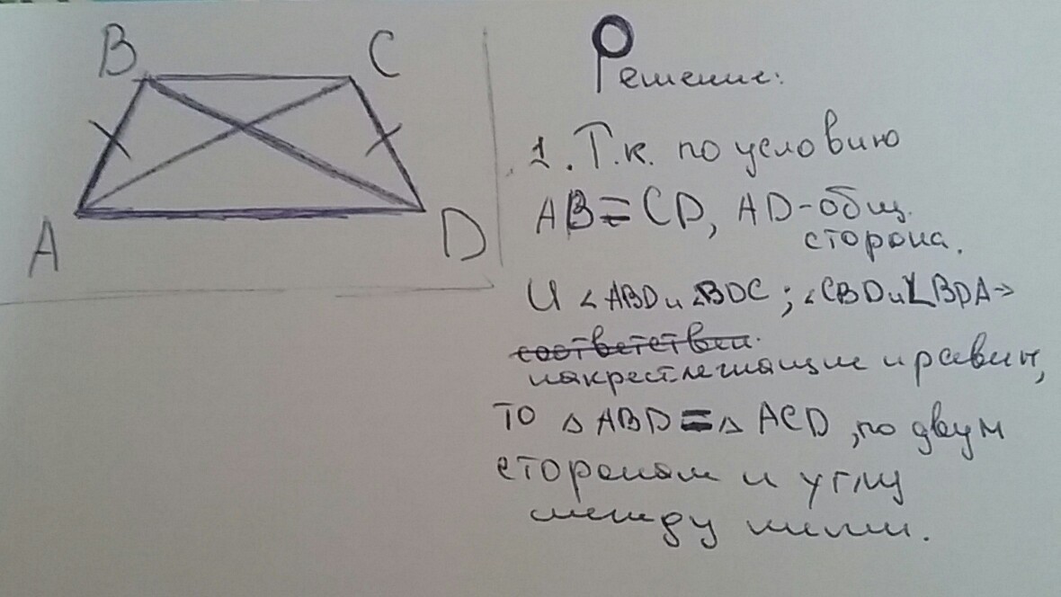 в равнобедренной трапеции АВСД проведены диагонали АС и ВД, стороны АВ и СД раны. Докажите что треугольник АВД=треугольнику АСД