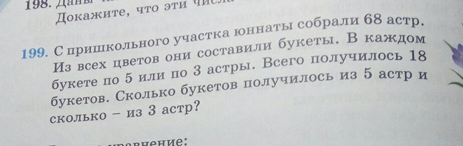 x - количество букетов из 5 астр. (18-x) - количество букетов из 3 астр. Всего астр 68.