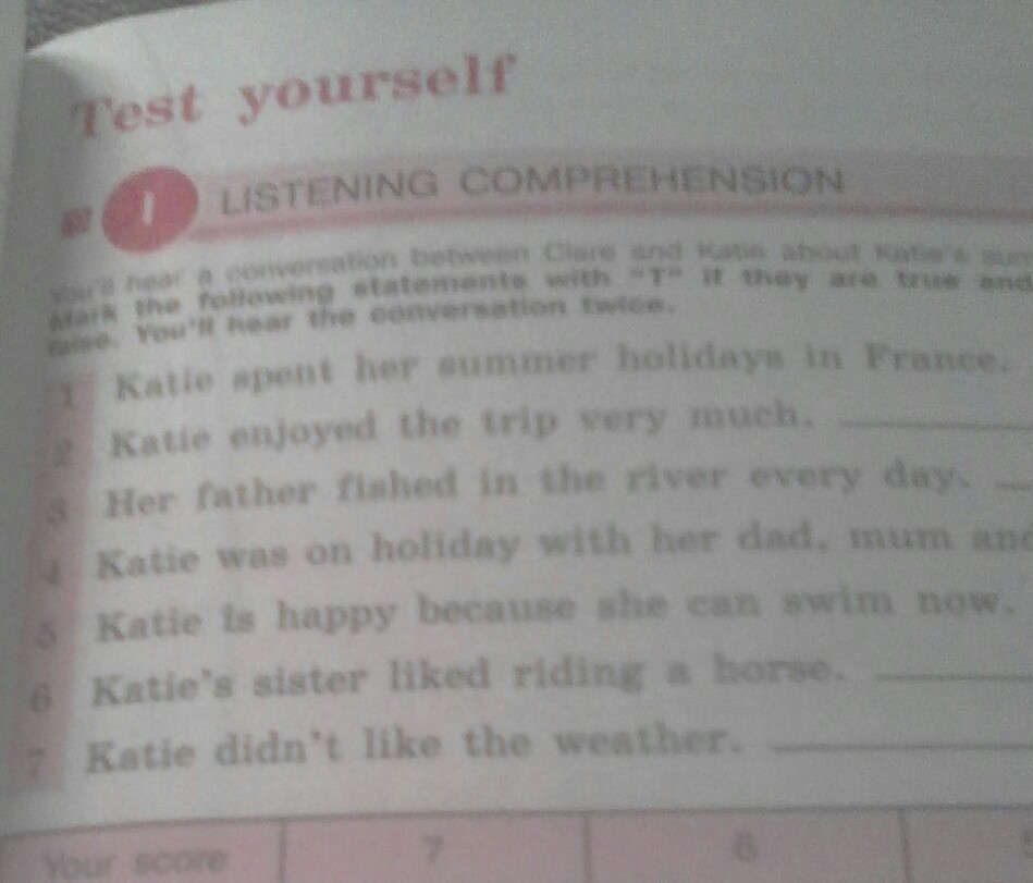 Катя повела свои летние каникулы во Франции. Катя очень довольна путешествием. Ее отец каждый день ловил рыбу. Катя была на каникулах со своим отцом, мамой и ... Катя счастлива, потому что она может плавать сейчас. Катиной сестре нравилось кататься на лошади.