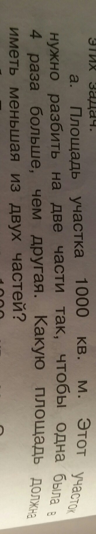 площадь участка 1000 квадратных метров этот участок нужно разбить на две части так чтобы одна была в 4 раза больше чем другая Какую площадь должна иметь меньшая из двух частей