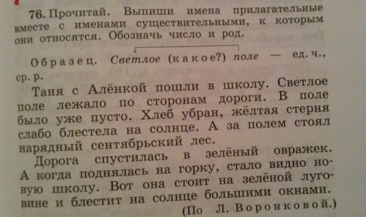 прочитай. Выпиши имена прилагательные вместе с именами существительными, которыми они относятся. Обозначьте число и род. образец. светлое Какое? Поле -единственное число, средний род. Таня с Алёнкой пошли в школу. Светлое поле лежало по сторонам дороги. В поле уже пусто. Хлеб убран, желтая серия слабо представлена солнце. А за полем стоят нарядные сентябрьский лес. дорога спустилась в зелёный овражек. а когда поднялось на горку, стало видно новую школу. вот она стоит на зеленый луговине и блестит на солнце большими окнами. Помогите пожалуйста