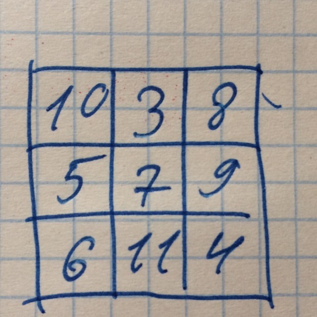 Вставь в пустые клетки числа 3,4,5,6,8,9 так чтобы квадрат стал *магическим* 10 * * * 7 * * 11 *