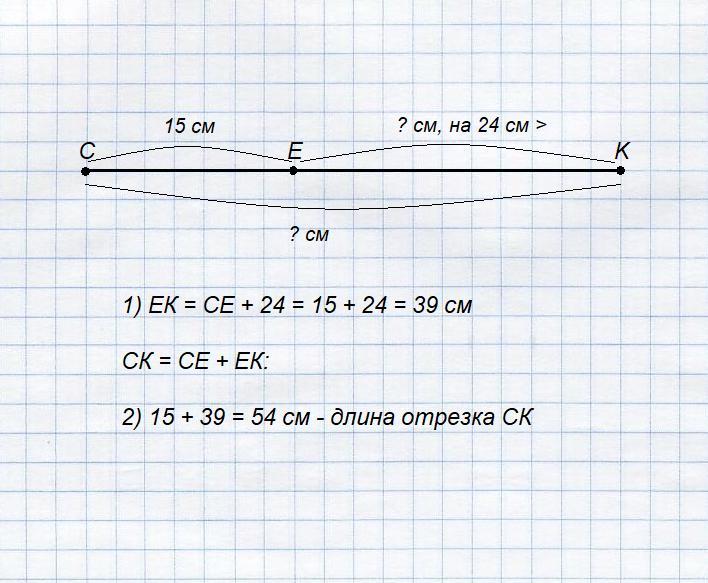 1. Точка E принадлежит отрезку CK, CE = 15 см, отрезок EK на 24 см больше отрезка CE. Найдите длину отрезка CK.