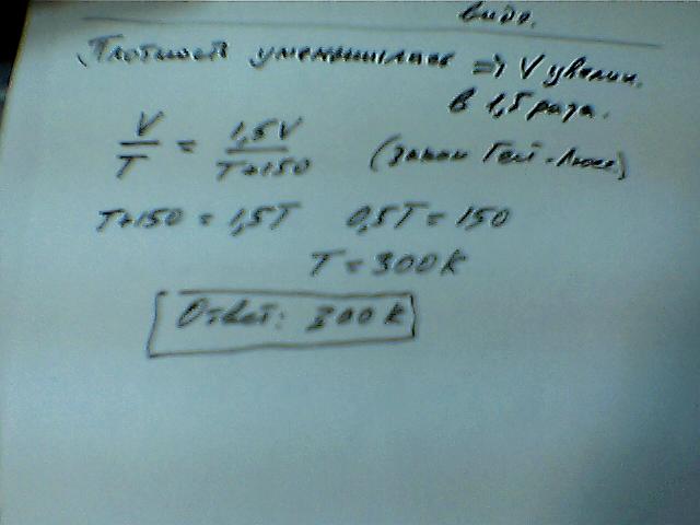 Идеальный газ изобарно нагрели на 150 градусов C. Чему была равна начальная температура газа, если его плотность уменьшилась в 1,5 раза?