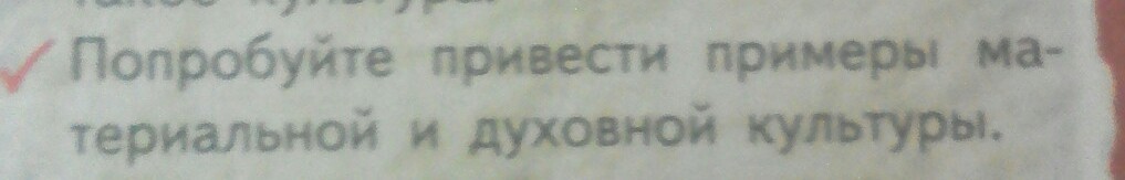 Примеры материальной культуры: дома, одежда, машины и любая техника, например холодильник или сотовый телефон, лекарства, продукты, приготовленные человеческими руками, а не взятые прямо из природы. .
