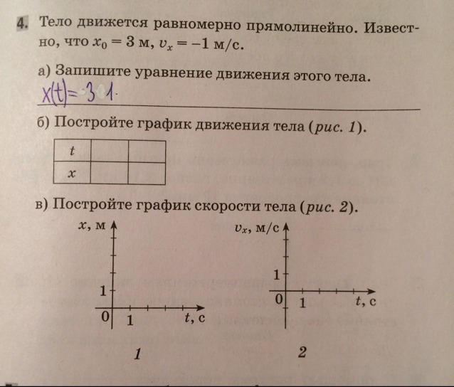 Тело движется равномерно прямолинейно. Известно, что X0=3м, Vx=-1м/с.