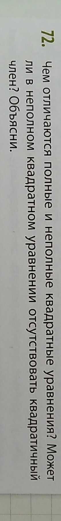 Полные от неполных квадратных уравнений отличаются тем, что в неполном квадратном уравнении или второй коэффициент равен 0, или свободный член равен 0, или же и второй коэффициент, и свободный член равен 0.