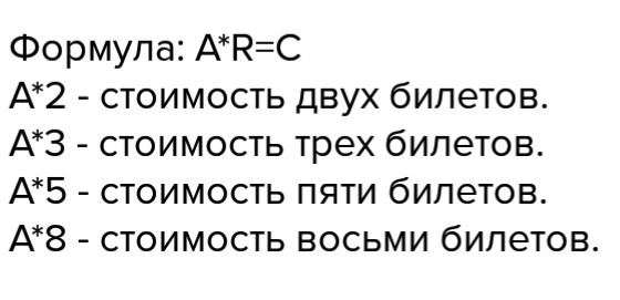 Цена билета для проезда в автобусе a тгшт.Какова стоимость 2 3 5 8 билетов.Обозначьте стоимость проезда в автобусе буквой C и запешите формулу для вычисления стоимости проезда в автобусе если будет куплено r билетов