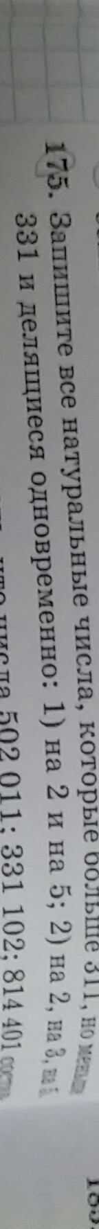 Запишите все натуральные числа которые больше 311 но меньше 331 и делящиеся одновременно на 1)2 и на 5 2)на 2 на 3 на 5 срочно