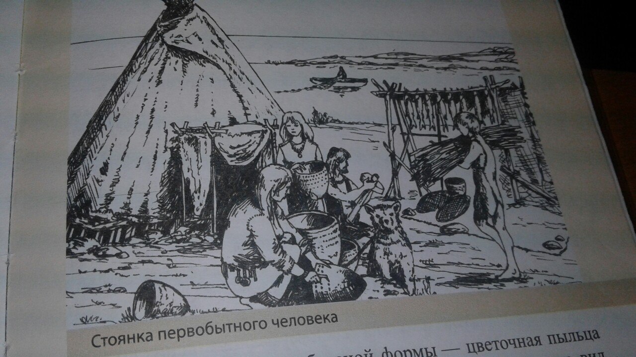 Люди живут в шалаше. Они ловят рыбу, сушат её, а после едят. Человек занимается рукоделием-вылепливает горшки. Кто-то таскает хворост, кто-то делает орудие. Человек на заднем плане плывёт на лодке, скорее всего охотясь на рыбу.