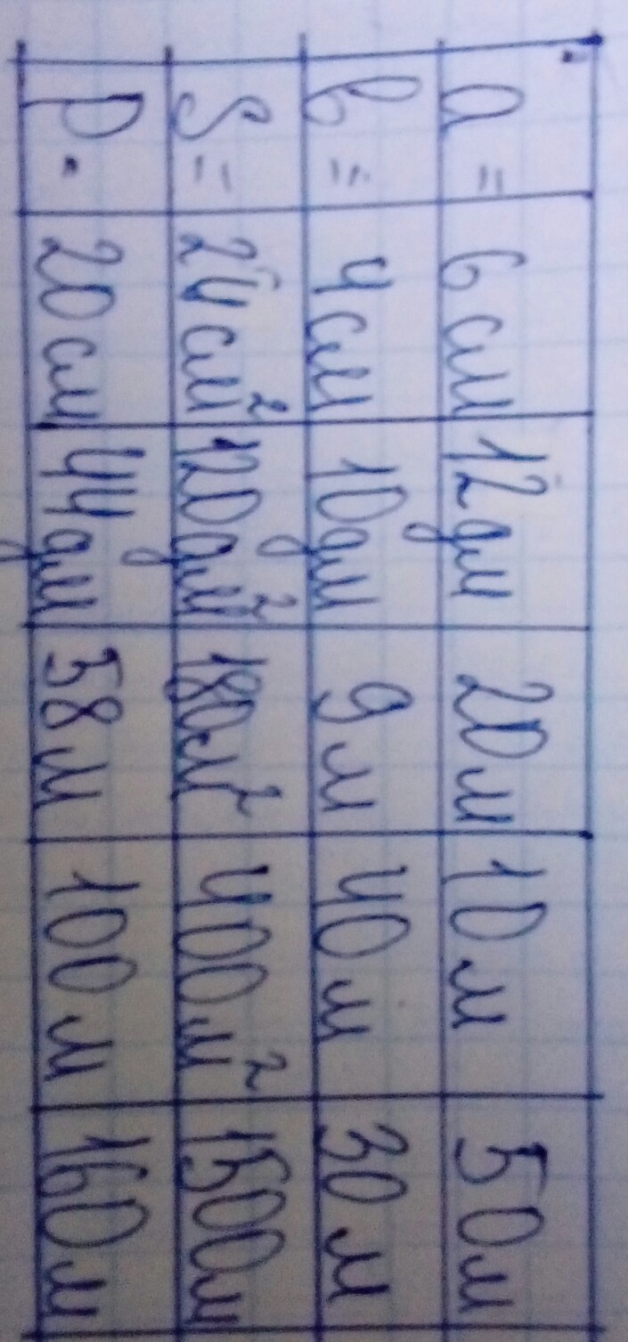 заполни таблицу. Длина прямоугольника6см,?,20м,?,40м50м ширина 4см,10дм,9м,40м.Площадь?,120дм2,?,?,400м2,?.Периметр?,?,?,280м,?,160м.
