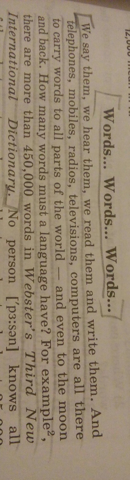 Мы говорим их, мы слышим их, мы читаем их и пишем их. И телефоны, мобильники, радио, телевизоры, компьютеры — все они нужны для того, чтобы донести слова во все части мира, и даже на луну и обратно. Сколько слов может быть в языке? Например, в новом, третьем международном словаре Webster более 450.000 слов.