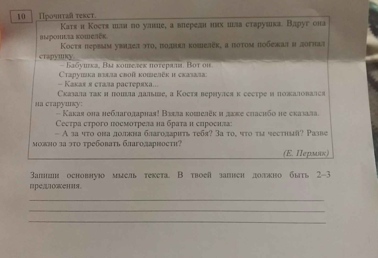 Бабушка взяла кошелек и не сказала спасибо.А сестра сказала брату то что бабушка не должна тебя благодарить за то что ты честный. Вывод:ты сам по себе должен быть честным.