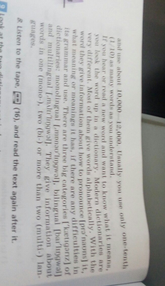 Никто не знает их всех, но большинство людей могут понять около 35 000 и использовать около 10 000-42 000. Обычно вы используете только (1/10) слов, которые вы понимаете.Если вы слышите или читаете новое слово и хотите знать, что это значит, вы смотрите слово в словаре. Современные словари очень разные. Большинство из них дают слова в алфавитном порядке. Со словом они дают информацию о том, как произнести его, какой смысл или значения он имеет, если есть какие-либо трудности в его грамматике и использовании. Существуют три категории словарей: одноязычные, двуязычные и многоязычные. Они предоставляют информацию о словах в одном (моно-), двух (би-) или более двух (многоязычных) языках.