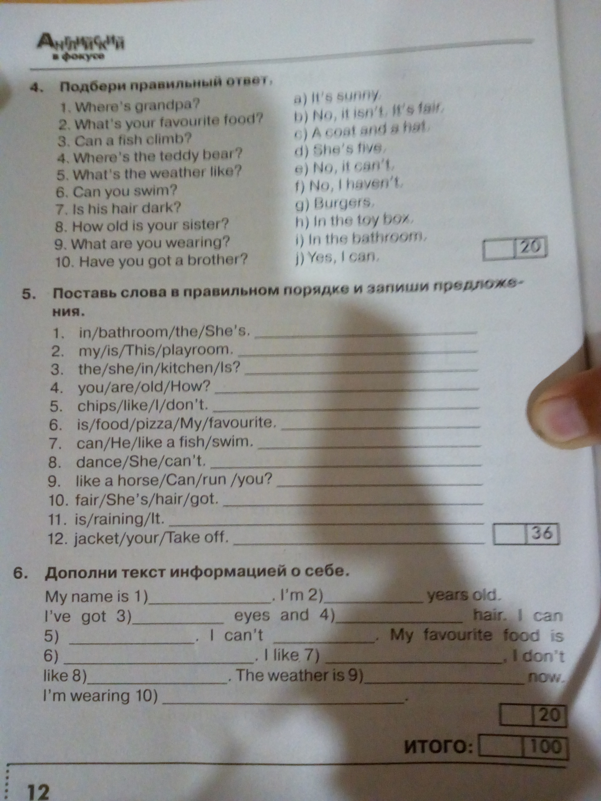 №5 1)She is the bathroom. 2)This is my playroom 3)Is she in the kithen 4)How old are you 5)I dont like ships 6)My favourite food is pizza 7)He can swim like a fish 8)She cant dance 9)Can you ran like a horse 10)She got fair hair 11)it is raining 12)Take off your jacket