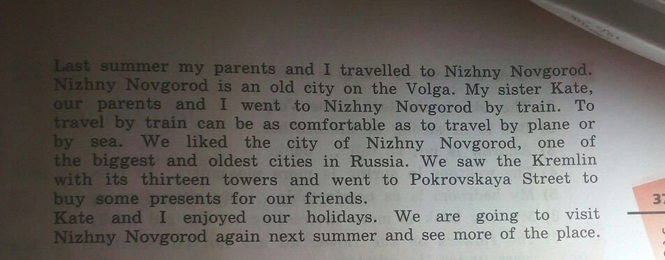 Прошлым летом мои родители и я путешествовали по Нижнему Новгороду. Нижний Новгород старый город на Волге. Моя сестра Катя, наши родители и я ездили в Нижний Новгород на поезде. Путешествие на поезде комфортнее чем путешествие на самолёте или корабле. Мы любим город Нижний Новгород , один из больших и старых городов России. Мы видим Кремль с его тринадцати башнями и ходили по Покровской улице покупали некоторые подарки для наших друзей.