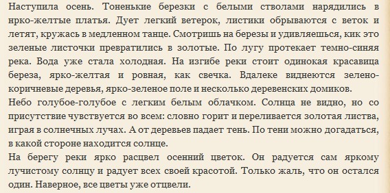Теплые, золотистые краски леса на картине перекликаются с холодной синевой воды. Слегка пожухлая трава и деревья, одетые в яркие сарафаны, говорят о том, что осень наступила совсем недавно. Березки, как подружки, собрались в хоровод на опушке леса. Они рады осеннему солнышку. Еще немного, и последние золотые листочки с них опадут на побуревшую траву. Греются на солнце две стройные осинки у реки. Они как-будто шепчутся друг с другом. Река несет свои свинцовые воды вдаль и резко поворачивает за лесом. На правом берегу реки березки еще не надели осенние наряды. На холме, за полями, виднеется деревня. Но она не нарушает всю эту осеннюю красоту.
