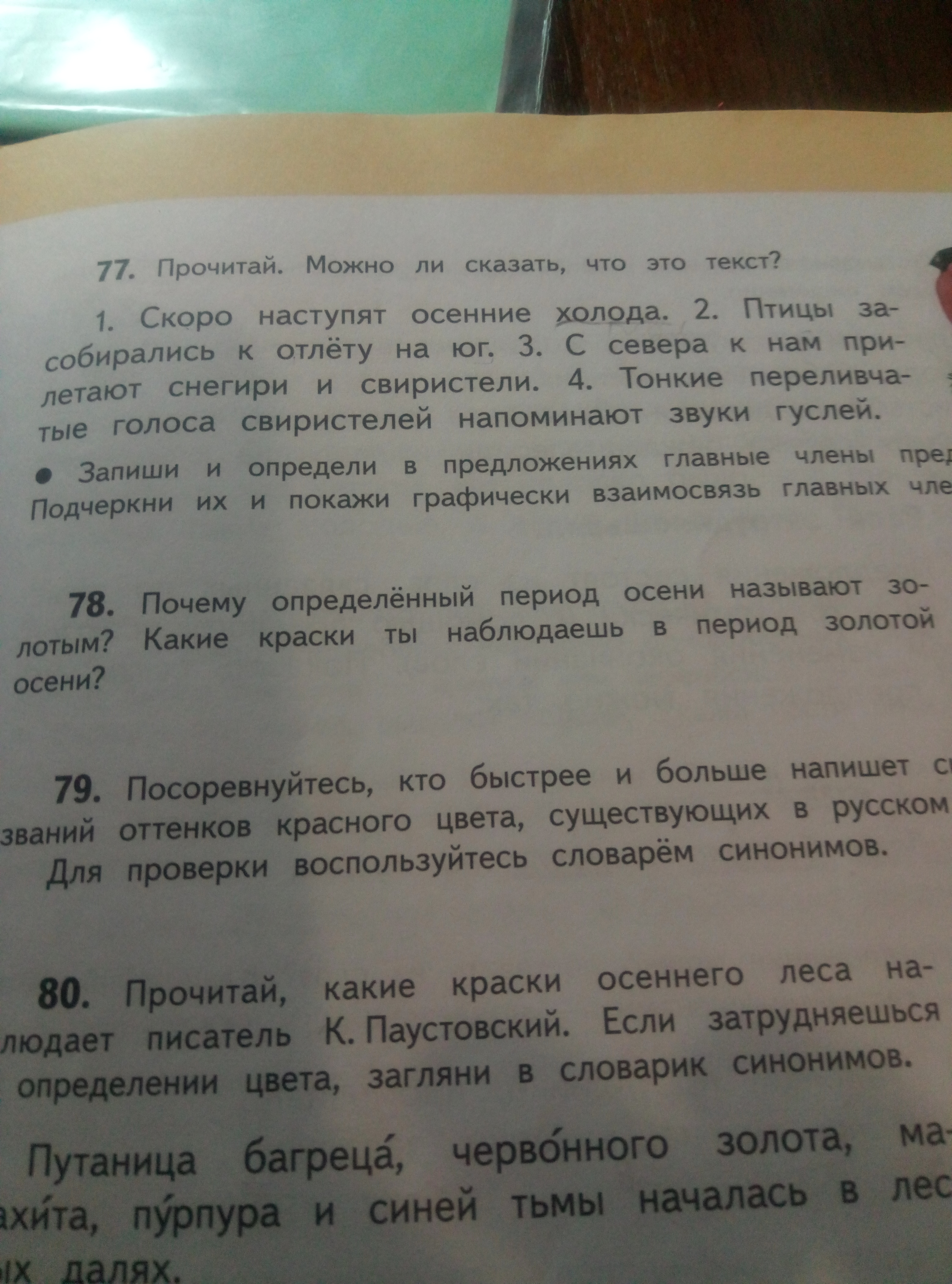 То что это текст сказать можно, есть предложения, связные по смыслу. Главные члены: наступят холода, птицы засобирались, прилетают снегири и свиристели, голоса напоминают