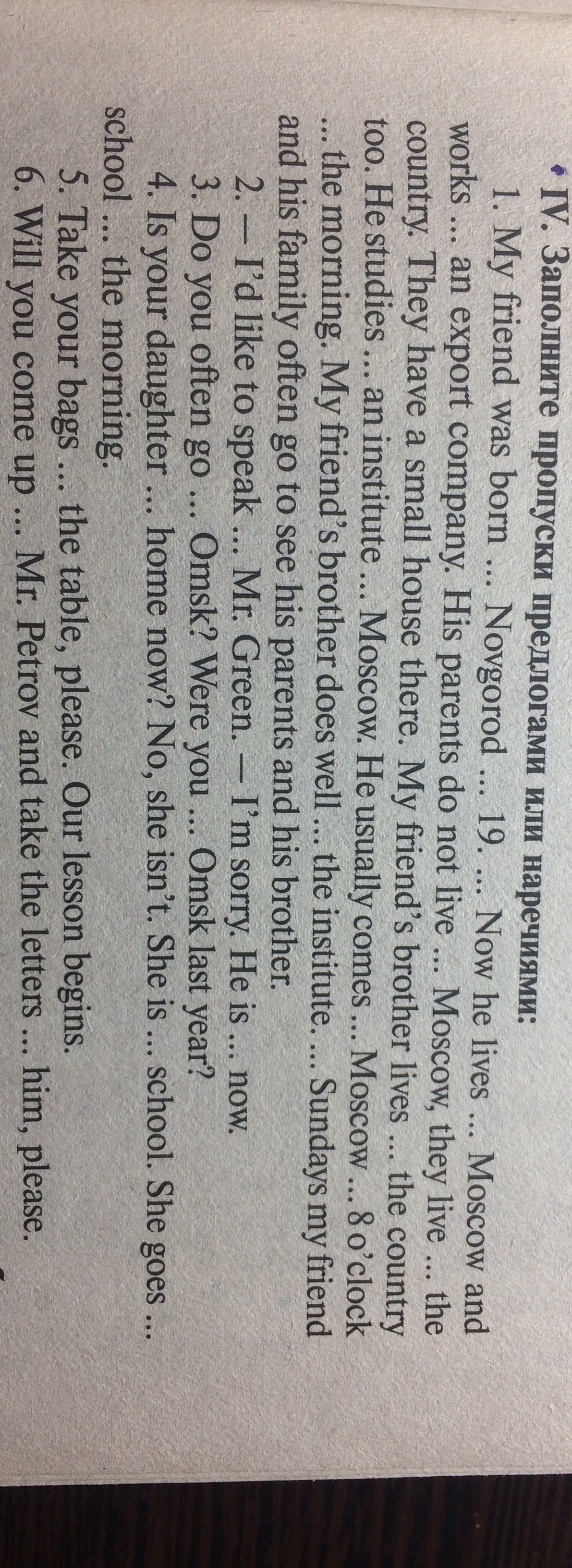 1) in, (Now he lives) in, works at, do not live in Moscow, live in the country, lives in the country, studies at an institute in Moscow, comes to Moscow at 8 oclock in the morning, does well at the institute, On Sundays