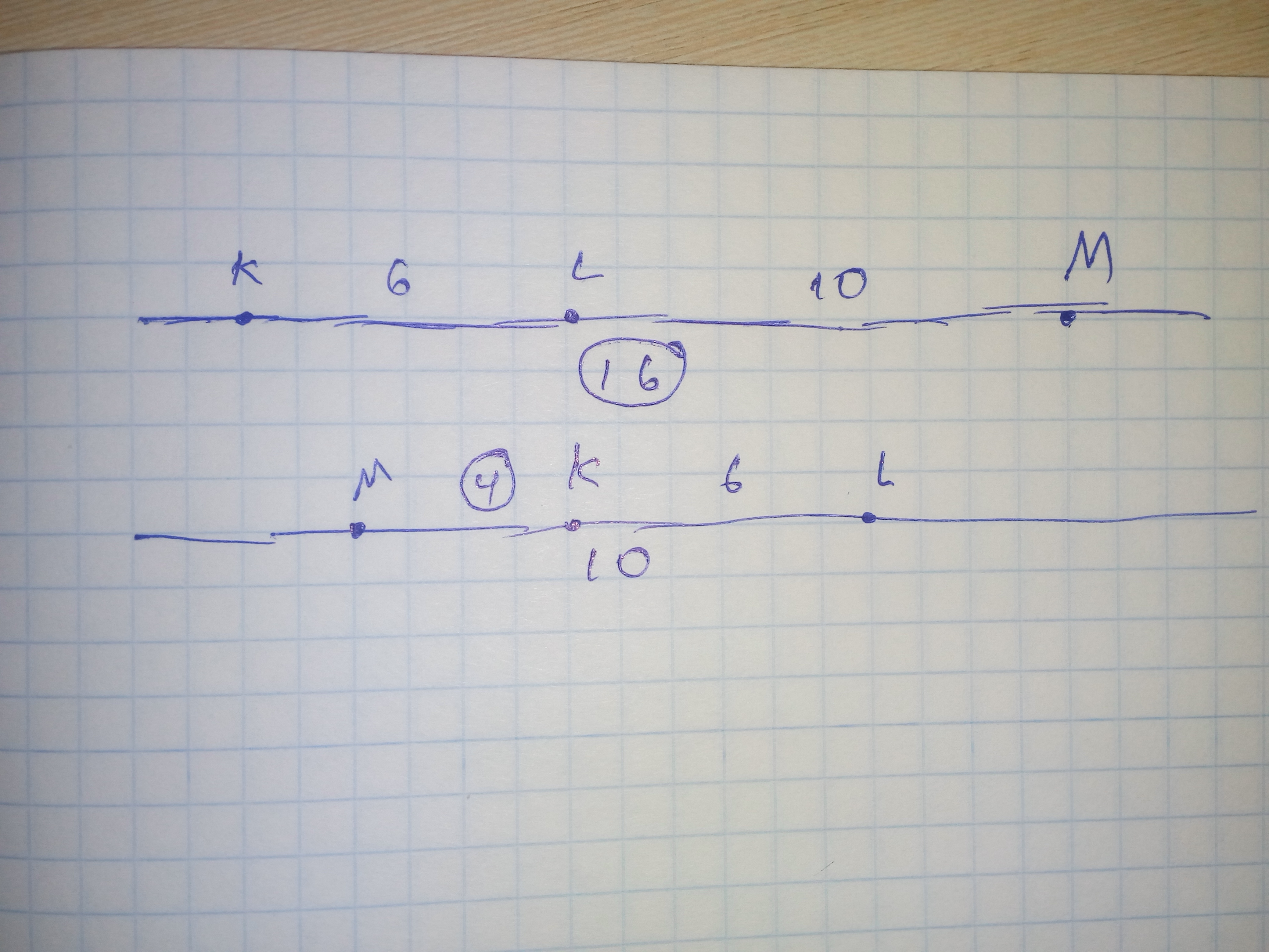 Три точки K, L, M лежат на одной прямой, KL=6см, LM=10см. Каким может быть расстояние KM? для каждого из возможных случаев сделайте чертёж.