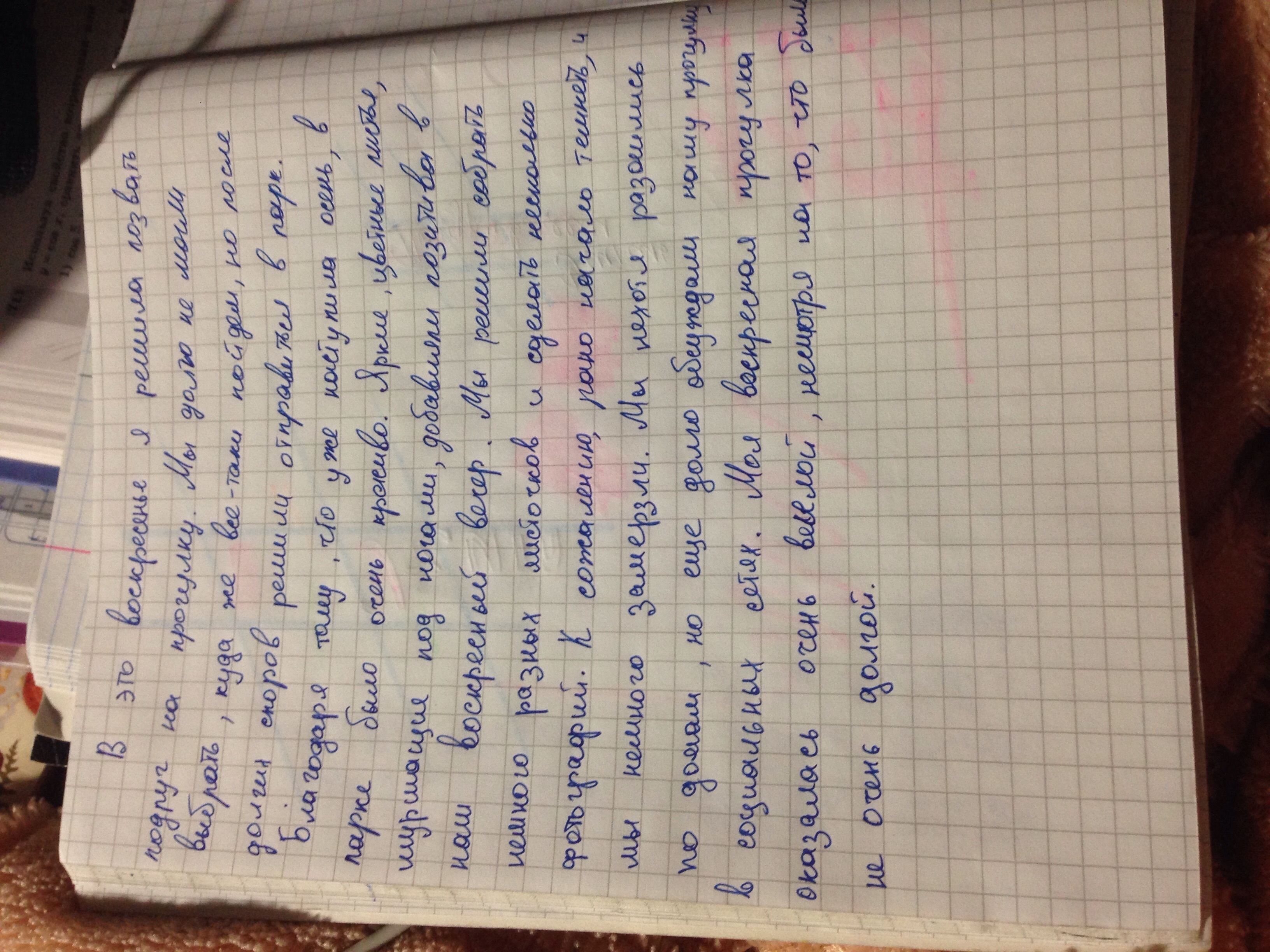 Сегодня был теплый летний день. Солнце как обычно сияло и пекло. Мне стало скучно и я решила позвонить своим друзьям. Я решила организовать поход в лес,друзья согласились. Мы договорились на вечер. Я собрала все самое необходимое. Таня была ответственная по еде,Тема главный по выбору музыки. Нашим путеводителем был папа Тани,т.к. он у нее лесник и знает местность лучше, чем мы.