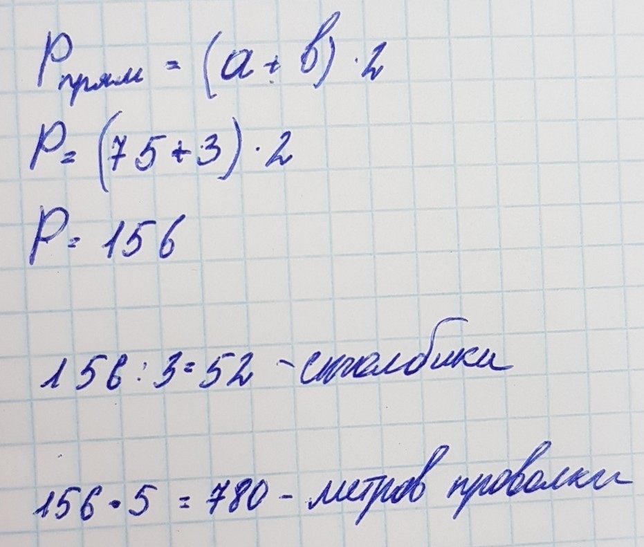 рабочие огородили участок прямоугольной формы длиной 75 м и шириной 3м для этого Они вбили столбики по углам участка также по его сторонам через каждые 3 м Затем через столбики протянули 5 рядов проволоки Сколько всего столбиков выбили рабочий Сколько метров проволоки ушло на ограждение участка