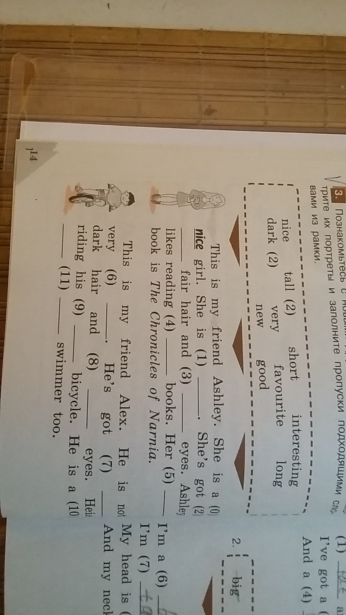 1. Портрет девочки.This is my friend Ashley. She is a nice girl. She is tall. She's got long fair hair and dark eyes. Ashley like reading interesting books. Her favourite book is The Chronicles of Narnia.