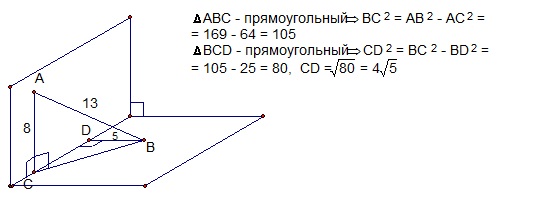 использовано: определение двугранного угла, перпендикулярность прямой к линии пересечения двух взаимно перпендикулярных плоскостей, теорема Пифагора