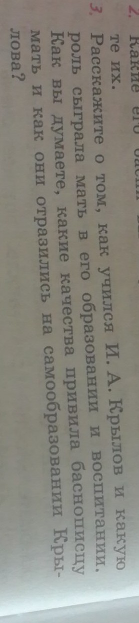 После смерти отца заботы о воспитании и образовании отпрыска взяла на себя мама. Ей пришлось отпустить старшего сына в чужой дом, в богатую и культурную семью Львовых. Там он сразу прислуживал и проходил курс наук вкупе с детками владельцев. Крылов осознавал, что ему необходимо полагаться только на свои силы, возможности, разум. Но для их развития требовались познания. Так ученье стало в очах Крылова единственно вероятным выходом из бедного состояния, потому он занялся самообразованием. А помогает ему в этом мама Мария Алексеевна. Она воспитала в своём сыне такие свойства, как усидчивость, бдительность, ответственность, усердие, щедрость, душевность, самостоятельность, житейская основательность, практичность.
