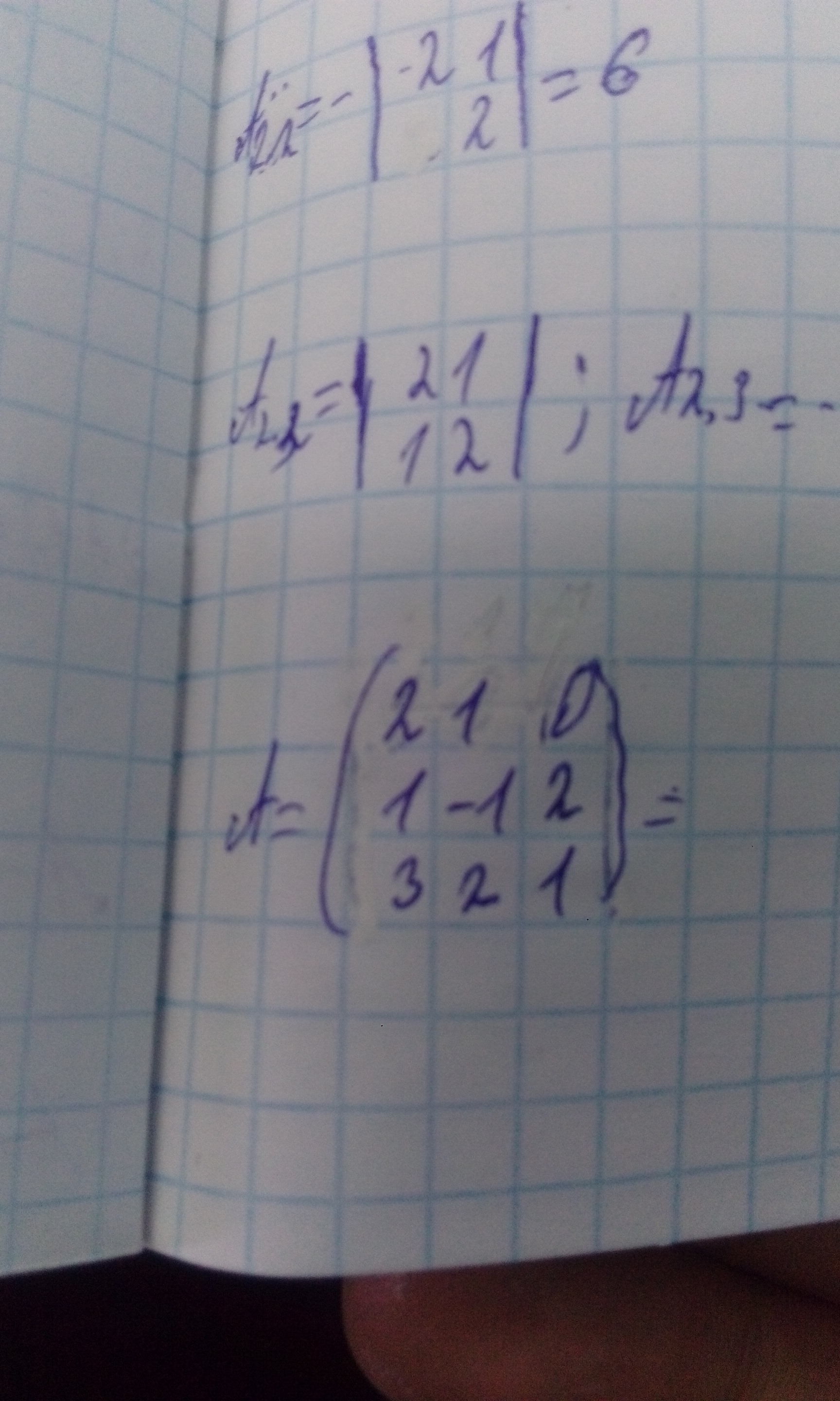 detA=  left|begin{array}{ccc}2&1&0\1&-1&2\3&2&1end{array}right| =2cdot   left|begin{array}{cc}-1&2\2&1end{array}right| -1cdot   left|begin{array}{cc}1&2&\3&1end{array}right| =\\\=2(-1-4)-(1-6)=-10+5=-5