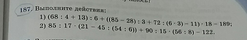 1)(68:4+13):6+((85-28):3+72(6*3)-11)*18-189=(17+13):6+(57:3+72*18-11)*18-189=