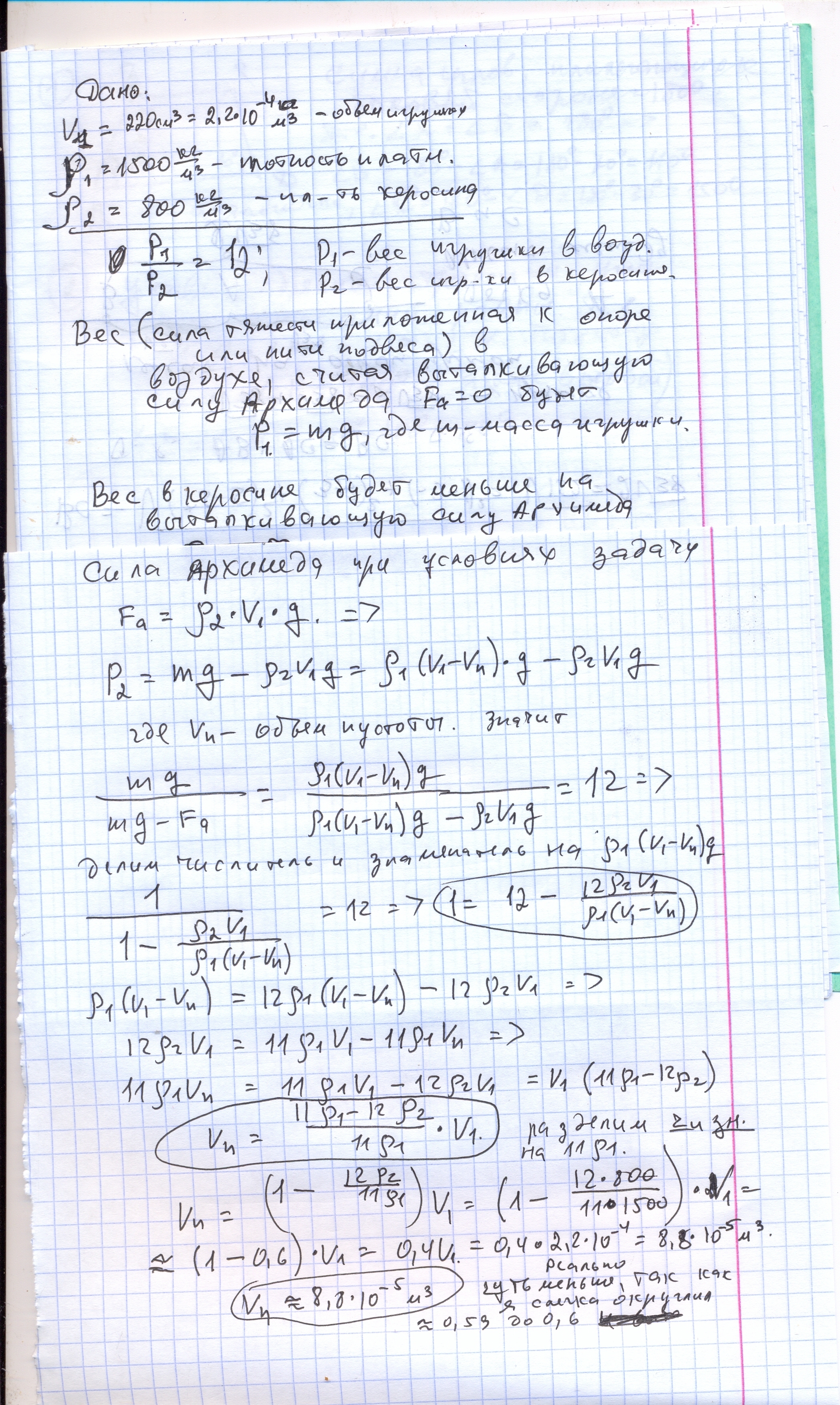 Полная пластмпссовая игрушка общим объёмом 220см в кубе при полном погружении в керосин весит в 12 раз меньге, чем в воздухе. Каков объём полости внутри игрушки, если плотность пластмпссв, из которой она сделана, равна 1500кг/м в кубе? Плотность керосина равна 800кг/м в кубе. Керосин внутрь не затекает!