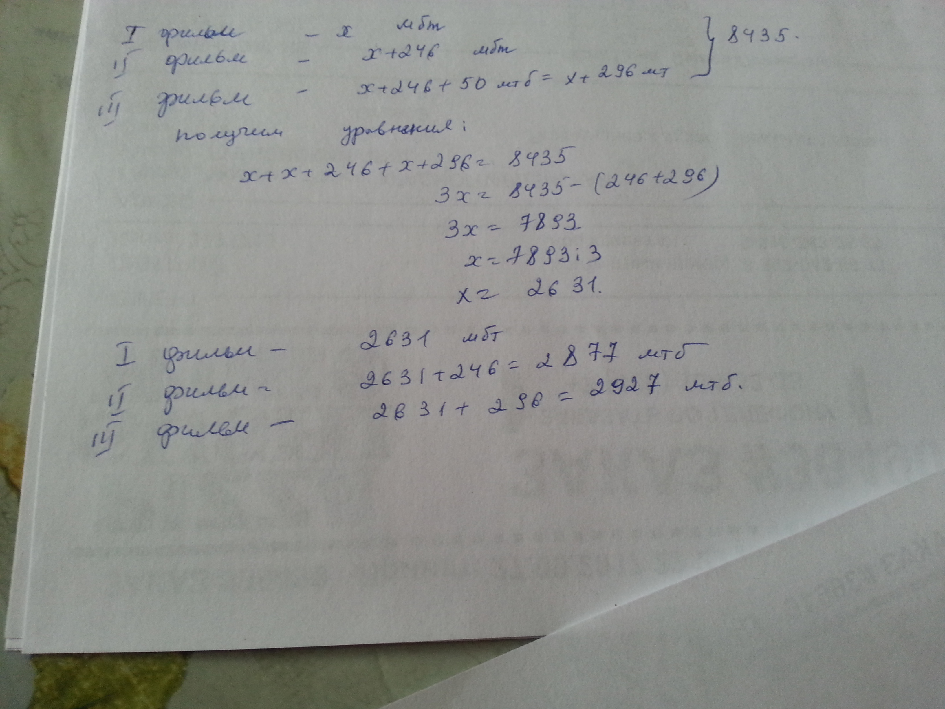 Помогите пожалуйста решить задачу 3 фильма на компьютере занимает 8335 МБ памяти размер 2 фильма на 246 МБ больше чем 1 размер 3 фильма на 50 мегабайт больше чем 2 сколько мегабайт составляет каждый фильм?