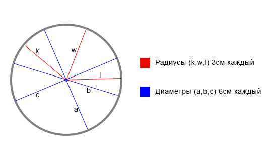 Начерти окружность,радиус которой 3 см.Проведи по 3 радиуса и по 3 диаметра,обозначь буквами и запиши их длины