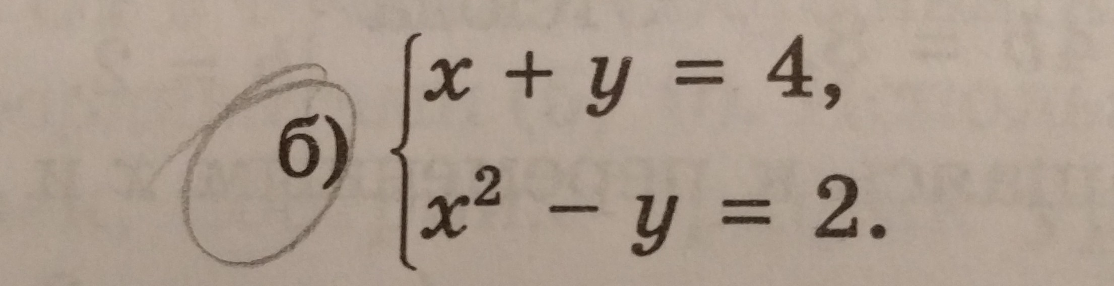 y=4-x. подставляем во 2 уравнение: x^2-(4-x)=2; x^2+x-4-2=0; x^2+x-6=0; D=1^2-4*1*(-6)=25; x1=(-1-5)/2, x2=(-1+5)/2. x1= -3, x2=2.y1=4-(-3)=7, y2=4-2=2. Ответ:(-3:7), (2:2).