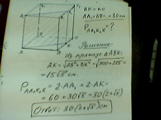дан куб ABCDA1B1C1D1, ребро которого равно 30 см. Постройте сечение куба, плоскостью альфа , прохоящей через AA1 и середину ребра BC. Найдите периметр сечения.