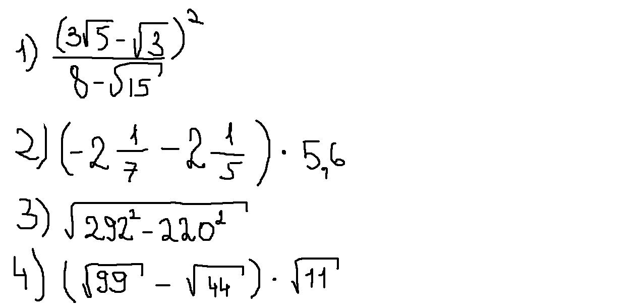 1)(3корень5-корнь3)^2/8-корнь15=45-6корень15+3/8-корнь15=48-6корень15/8-корнь15=6*8-6*корень15/8-корнь15=6(8-корнь15)/8-корнь15=6 сокращаем на 8-корнь15.