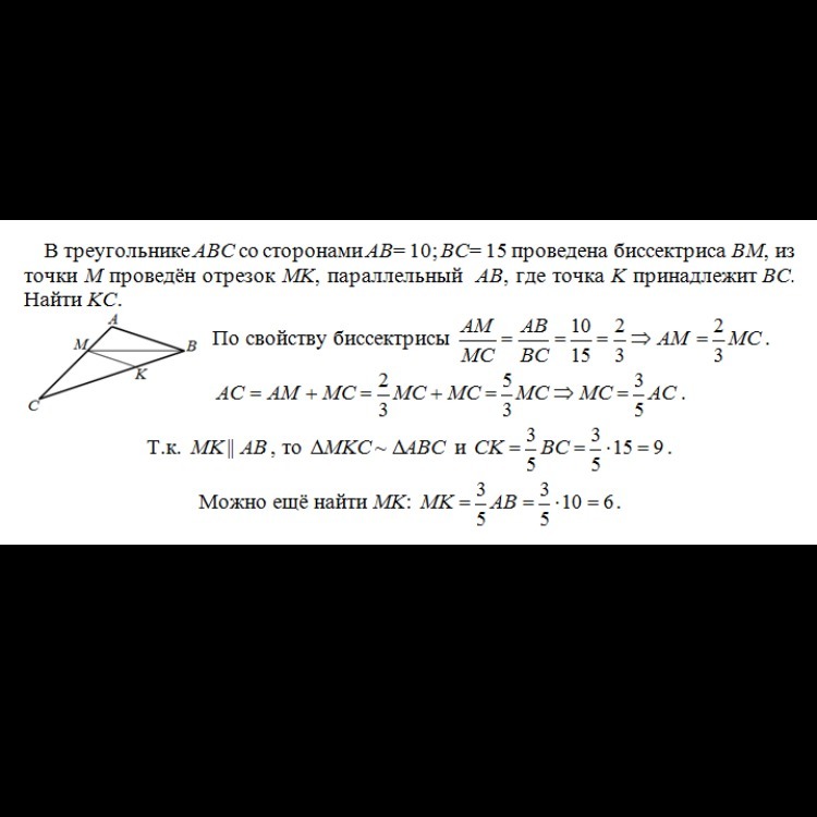 В треугольнике АВС со сторонами АВ =10 см , ВС =15 см проведена биссиктриса ВМ . Из точки М проведён отрезок МК||АВ, где К € ВС. Найдите КС