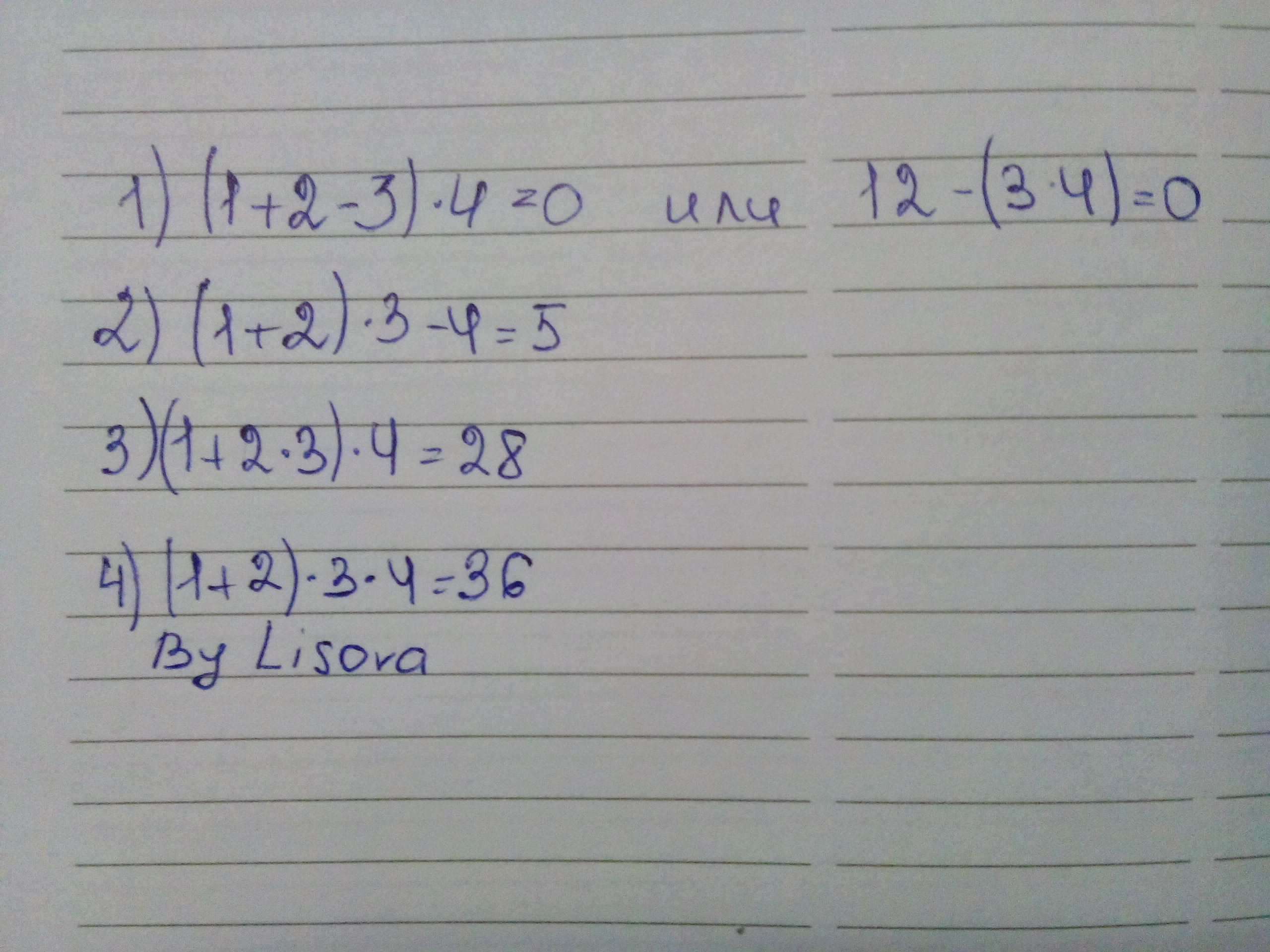 расставь знаки действий и скобки так,чтобы получить заданные числа. 1 2 3 4=0 1 2 3 4=5 1 2 3 4=28 1 2 3 4=36