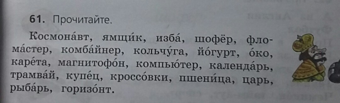 Горизонт, изба, йогурт, календарь, карета, комбайнер, компьютер, кольчуга, космонавт, кроссовки, купец, магнитофон, око, пшеница, рыбак, трамвай, фломастер, царь, шофёр, ямщик.