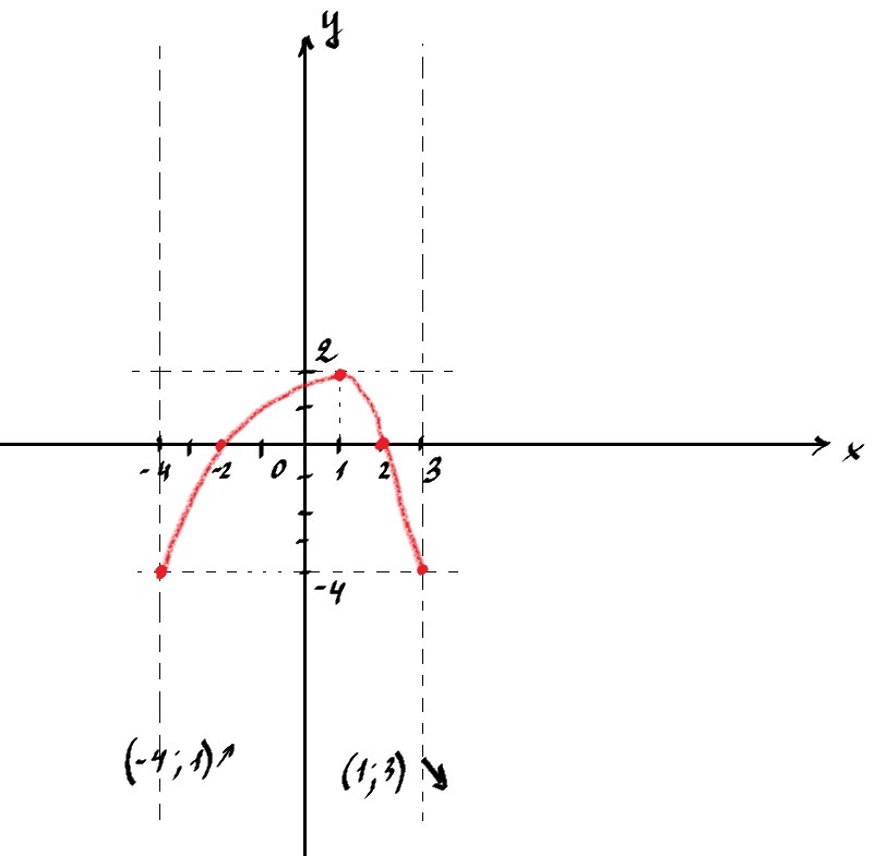 изобразите график функции,зная,что;:а)область определения функции есть промежуток [-4:3];б)значения функции сотавляют промежуток [-4:2];в)производная функции положительна на (-4:1),отрицательна на (1:3); г)1 - нуль призводной функции; д)-2 и 2 - нули функции